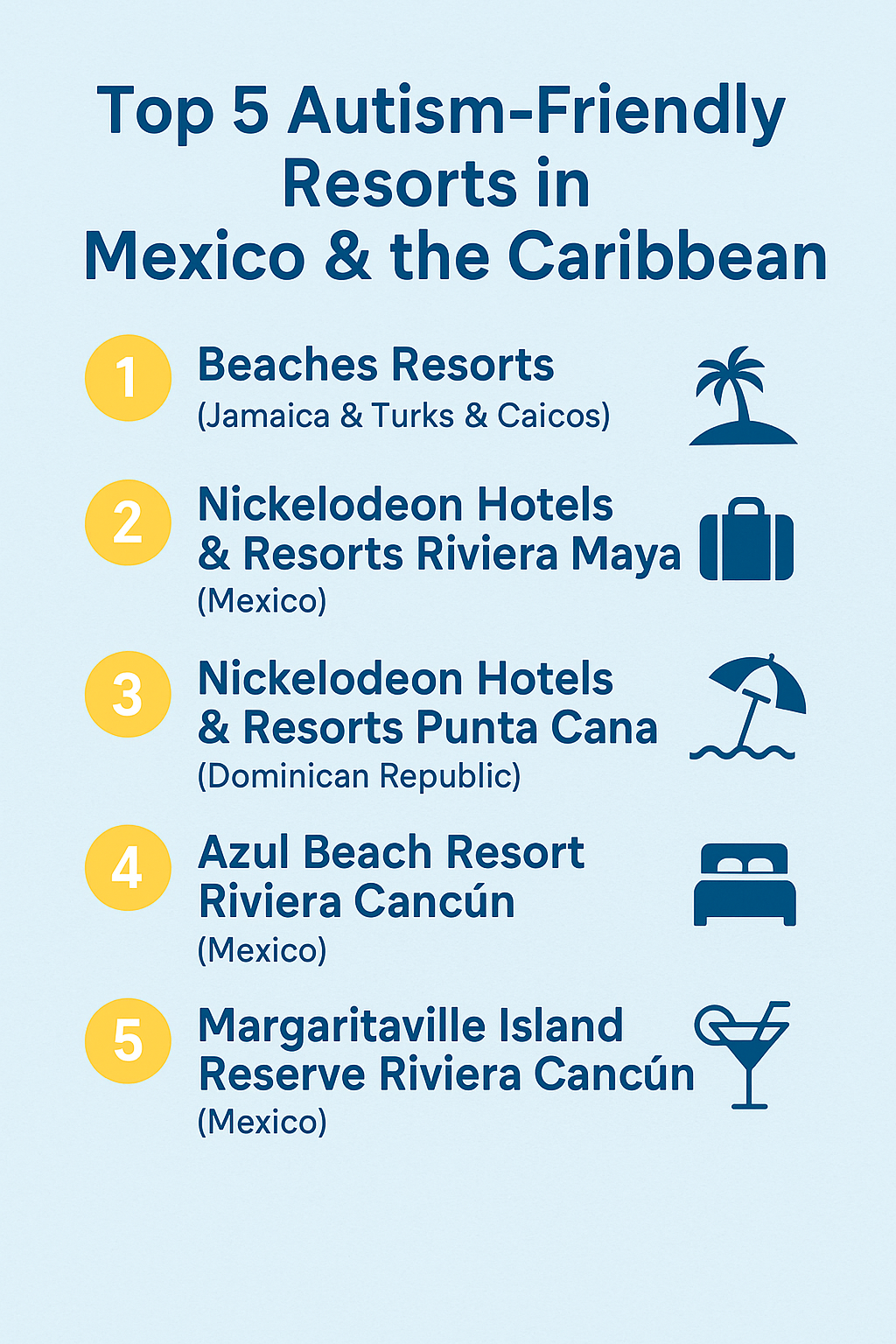 ✈️💙 Top 5 Autism-Friendly Resorts in Mexico & the Caribbean 💙✈️ Traveling can feel overwhelming when you’re neurospicy or traveling with autistic family members — but some resorts are going the extra mile to create welcoming, supportive spaces. Here are 5 amazing options to know about: 1️⃣ Beaches Resorts (Jamaica & Turks & Caicos) The only resorts in the Caribbean with the Advanced Certified Autism Center (ACAC) designation. Staff are trained, sensory guides are available, and they even offer